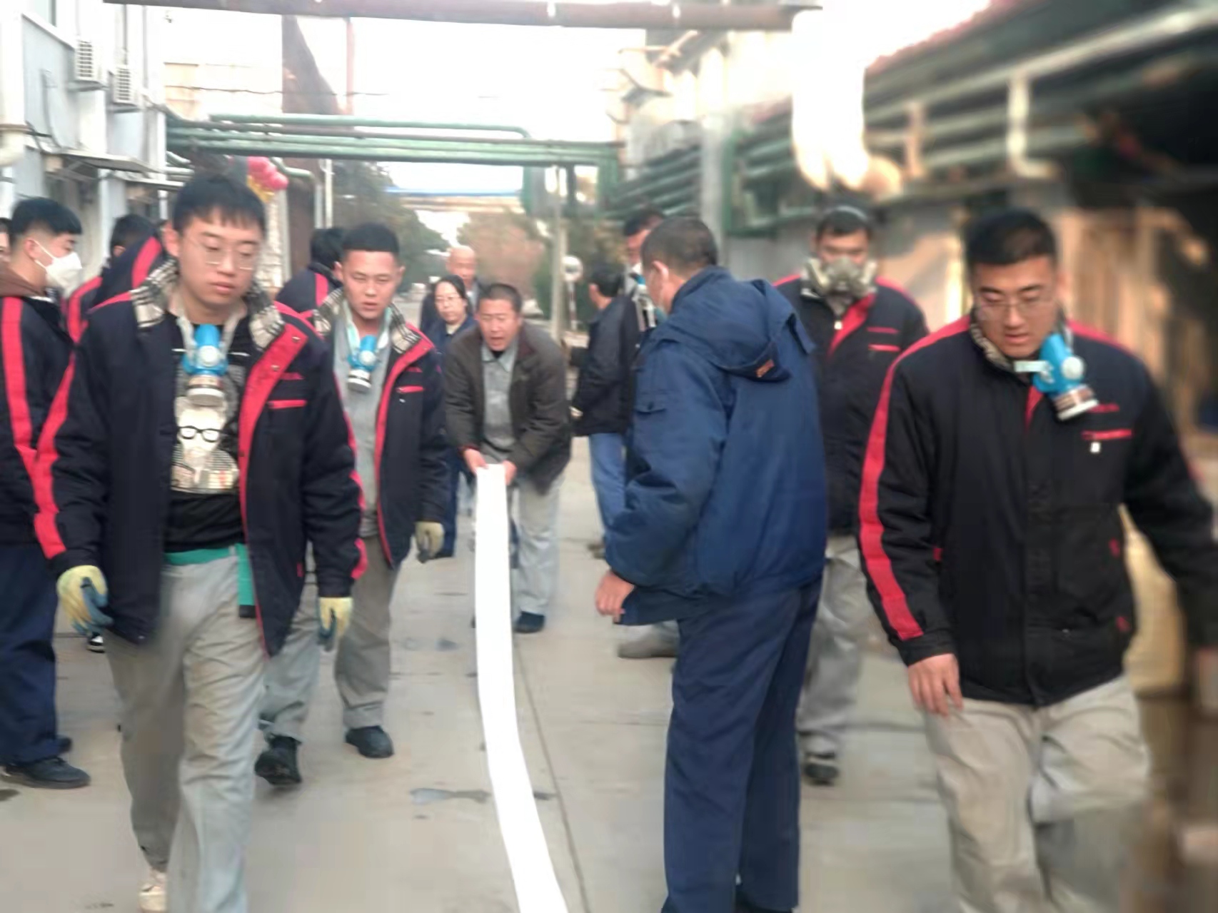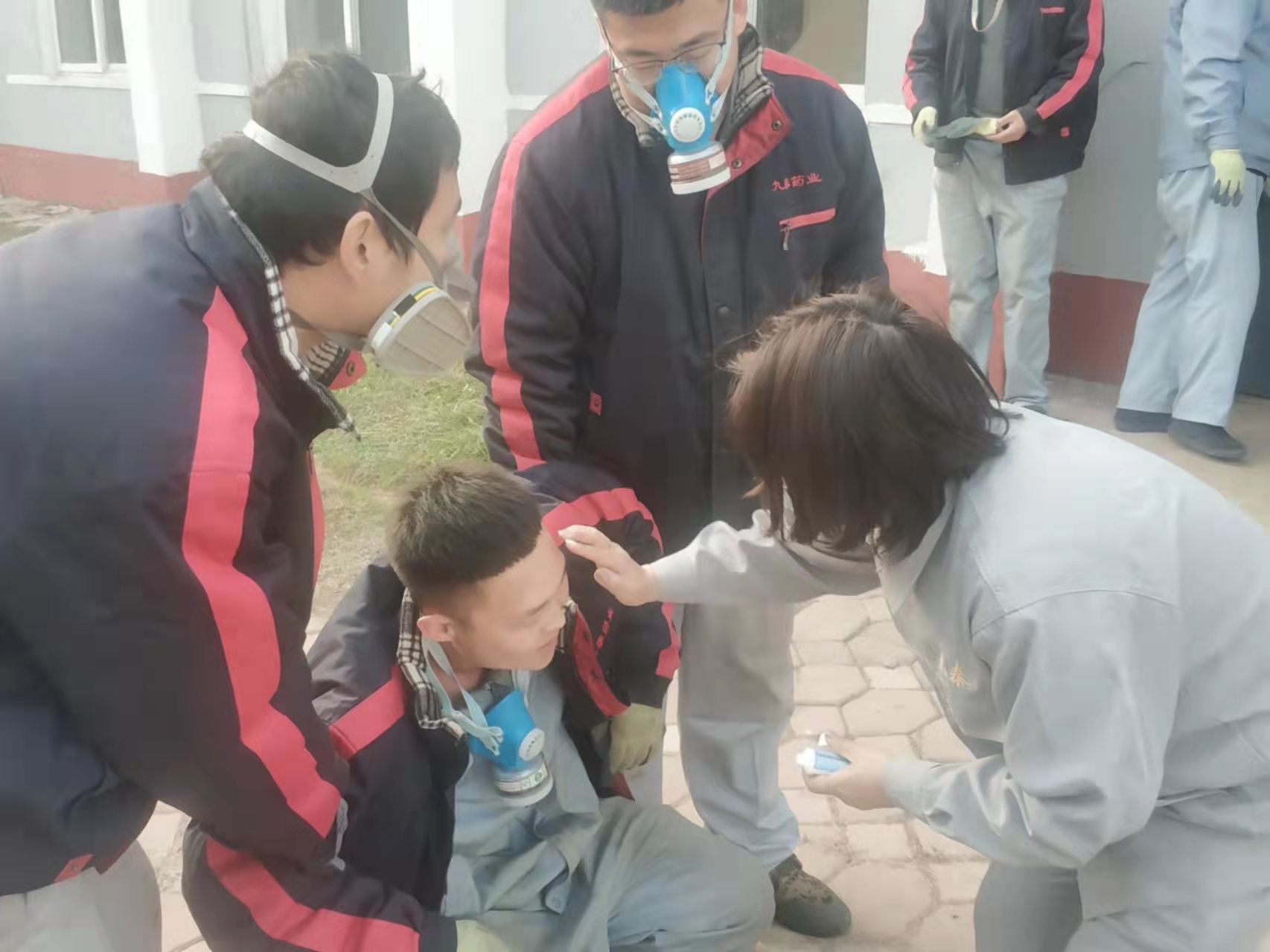 演練模擬原料車間合成一室發(fā)生火災爆炸,車間立即啟動應急預案,進行實際演練。